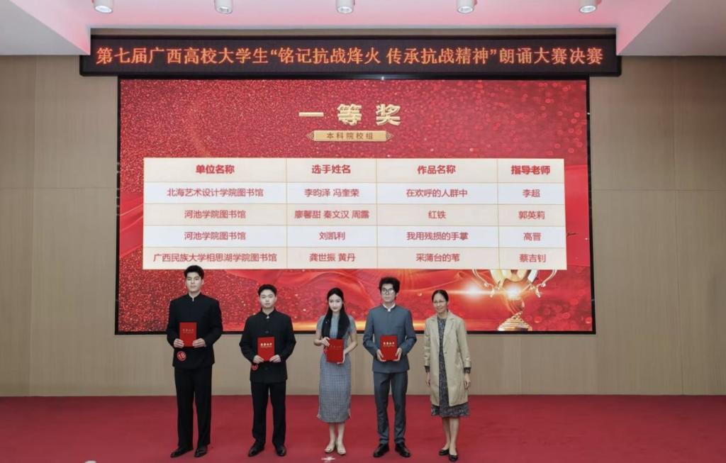 11月16日,第七届广西高校大学生“铭记抗战烽火 传承抗战精神”朗诵大赛决赛在南宁师范大学圆满落幕。我校教师教育学院廖馨甜、秦文汉、周露的合诵作品《红铁》,音乐舞蹈学院刘凯利的独诵作品《我用残损的手掌》分别荣获本科组一等奖。郭英莉、高晋荣获“优秀指导教师”称号。