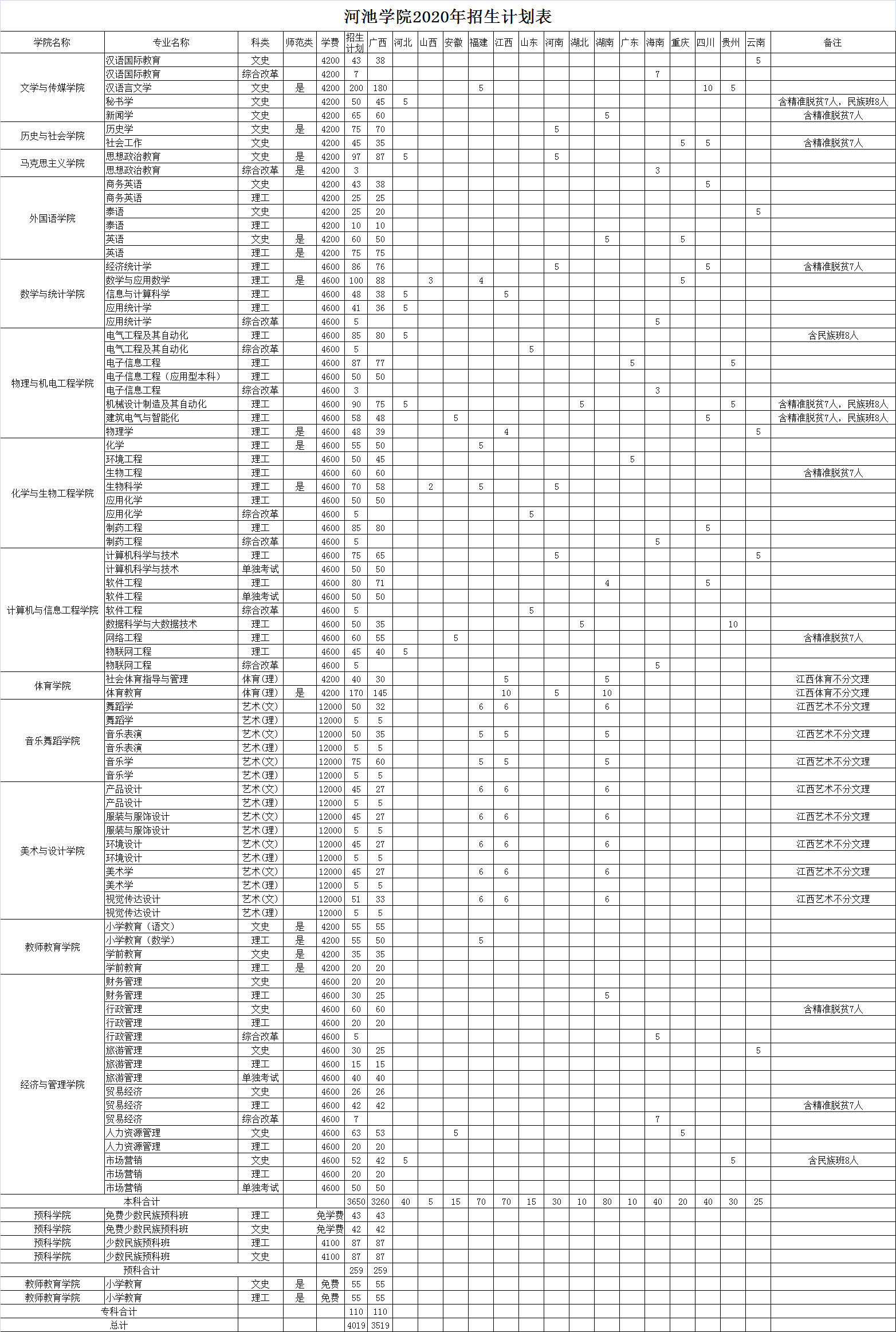 河池学院2020年招生计划表