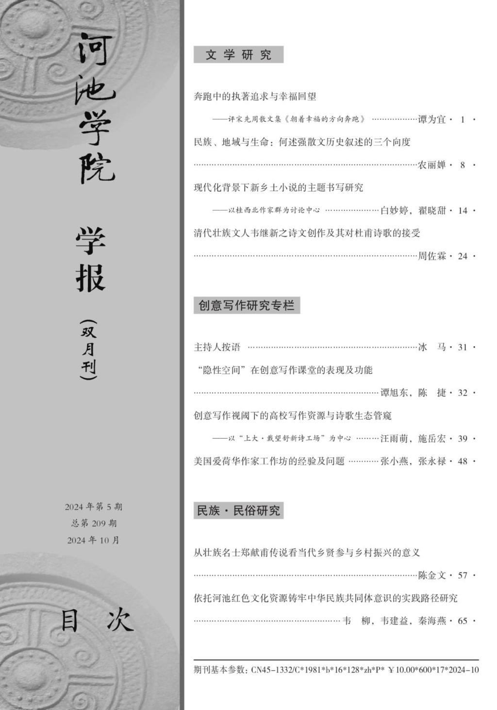 《河池学院学报》依托学校文学写作人才培养的办学特色和资源,邀请学校文学与传媒学院冰马博士担任栏目主持人,从2024年第5期开始开设常设栏目“创意写作研究”。栏目旨在反映高校创意写作学科体系化建设所取得的实效,呈现学科建设者、教育实践者们的理论思考,是目前高校学报中唯一一家开设“创意写作研究”常设栏目的学报。学报从2024年第5期开始至今,已经刊发了张永禄、谭旭东等专家、学者撰写的12篇论文,内容涉及创意写作的发展、学科的理论体系构建、各高校创意写作教育教学实践、不同文体案例分析等;作者来自上海大学、温州大学、西北大学、井冈山大学、云南大学、赣南师范大学、澳门科技大学等高校。未来学报将继续加强与相关高校、学者、教育者的联系与交流,开拓稿源,促进栏目的长期建设。(撰文黄猛,校对黄倩昵,审核李波)