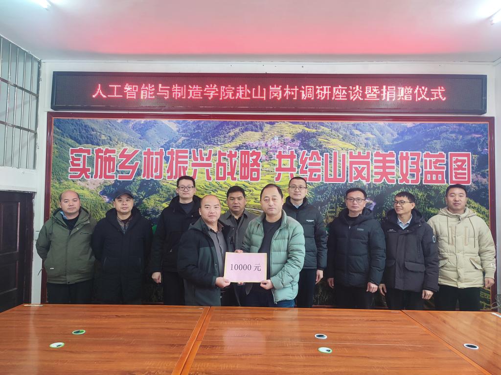 座谈结束后,举行了简洁而庄重的捐赠仪式。人工智能与制造学院全体教职工向山岗村捐赠人民币一万元,专项用于村内太阳能路灯建设,以改善村民夜间出行条件,提升乡村人居环境质量。该批路灯计划安装10盏,覆盖村内主要公共区域,将有效解决照明不足问题,为村民晚间活动提供便利与安全。