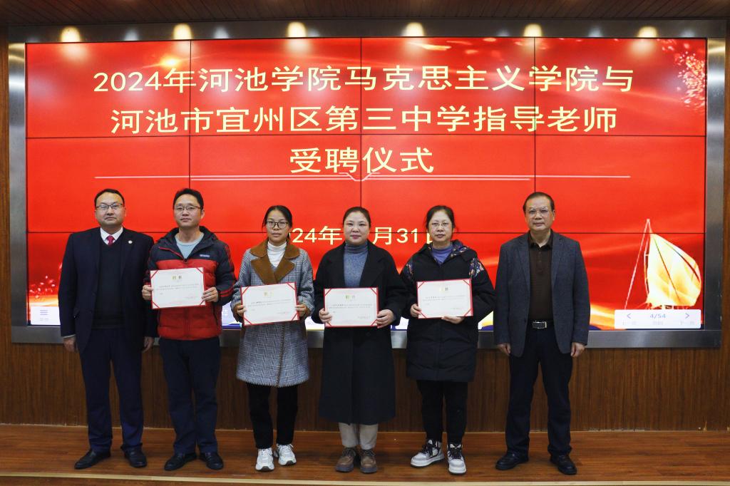 闭幕式中,首先由马克思主义学院执行院长江洪明就两校合作开展大中小学思政课一体化建设研讨活动进行总结,并同宜州区第三中学兰雄刚校长一起为本次教学课例展示教师以及两校师生合作参加2024年全国大学生数字素养与技能大赛荣获一等奖的获奖者进行颁奖。随后还举行了河池学院马克思主义学院与河池市宜州区第三中学指导老师互聘仪式。