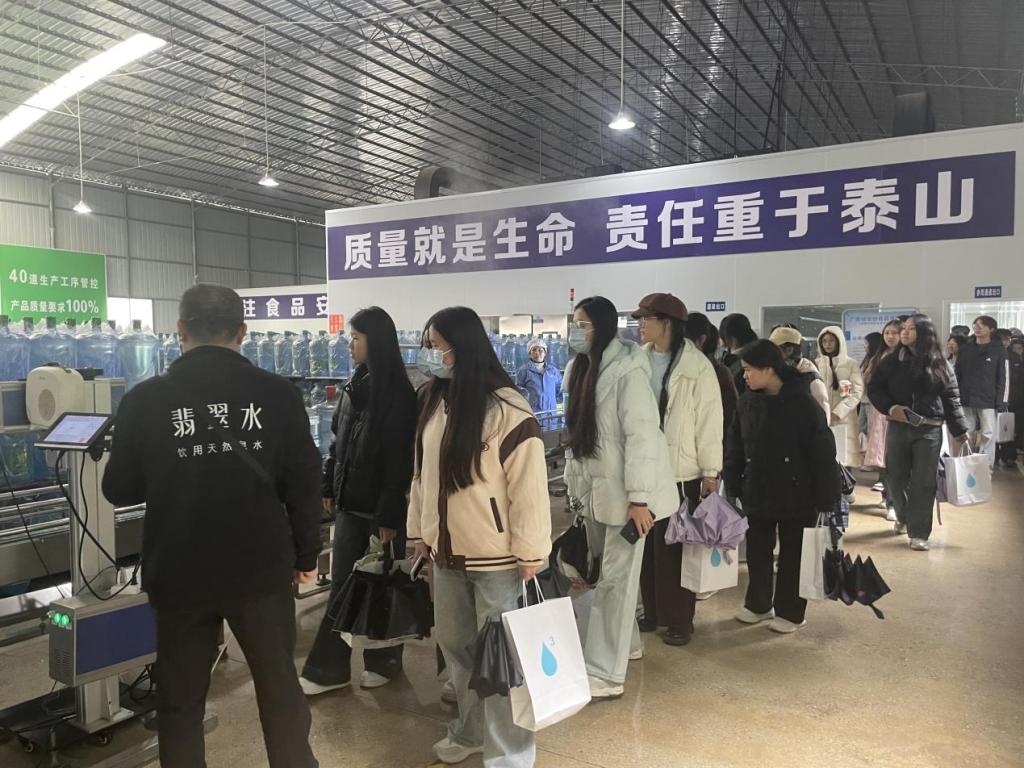 在公司的系统安排下,师生们依次参观了企业的办公区、仓储区与生产区。在办公区域,师生们通过企业宣传片与管理人员的讲解,深入了解了悦缤纷公司的发展历程、企业文化与组织管理架构,感受到企业严谨有序的办公环境与团队协作氛围;随后,师生们走进标准化仓储区。规范有序的原料与成品分区、高效的物流调度流程,让同学们对供应链管理、库存控制等课堂理论有了具象化的认知;进入核心生产区,在严格遵守卫生规范的前提下,师生们透过参观通道,近距离观摩了从原料预处理、自动化生产、无菌灌装到产品包装的全过程。企业质量负责人详细介绍了生产各环节的质量控制标准与食品安全管理体系,使“质量安全”从抽象概念转化为同学们眼中一道道严密的工序与一次次精准的检测。