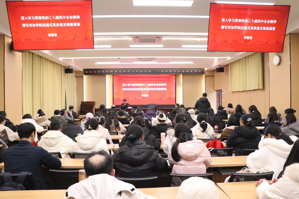 本次报告主题鲜明、内容丰富、论述深刻,既有理论的高度,又有实践的指导性,学习现场引发了师生们热烈的反响。大家纷纷表示,积极学思践悟党的二十届四中全会精神,自觉将学习成效融入教学、科研、管理和学业成长实践之中,以更加饱满的热情和昂扬的斗志,奋力谱写河池学院赶超式高质量发展新篇章,为扎实推进中国式现代化建设贡献智慧与力量。(作者:何彬发 拍摄:韦雅文 校对:韦雅文 审核:韦晖)