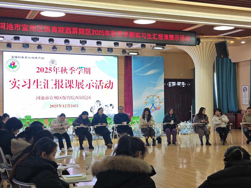 2025年12月24日上午,我院在河池市宜州区保育院西屏院校实习的学前教育专业241A班同学开展实习汇报课活动,师范技能教研室主任凌俐副教授和学前教育教研室教师黄怡冰、蒙素石、兰涛以及周虹等前往听课观摩指导。本次活动旨在检验学前教育专业实习生的教学实践成果,搭建交流提升平台,切实深化园校协同育人成效。