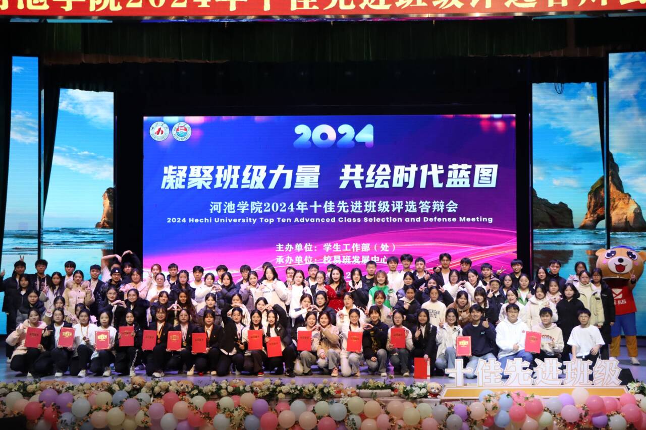 12月16日晚,河池学院2024年十佳先进班级评选答辩会在艺术楼表演厅举行,我院数学与应用数学221班、应用统计学22班两个班级参加评选。我院两个班级通过PPT、小视频展示和文艺创作表演等丰富多彩的形式,全面展示了班级建设、学风建设、专业学习、技能竞赛、科研活动、文体活动、志愿服务、社会实践以及校园生活等方面的丰硕成果。在激烈的角逐中,我院两个班级取得优异成绩,荣获2024年河池学院十佳先进班级。