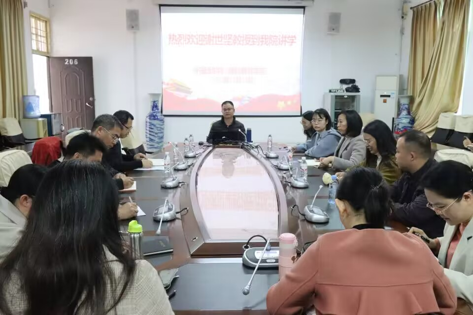 2023年12月13日,广西师范大学外国语学院谢世坚教授莅临我院讲学,讲座在东区行政楼206举行。讲座由我院党委书记韦合主持,我院全体教职工参加。