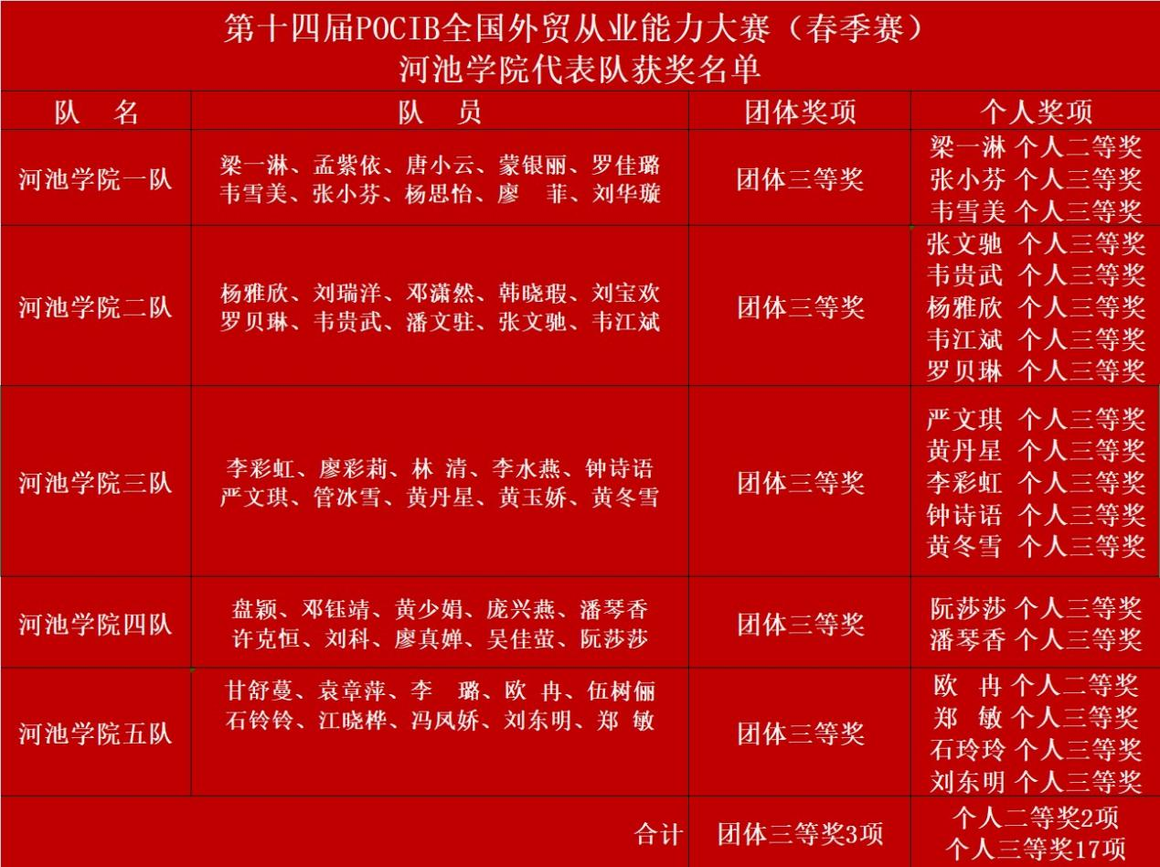 4月19日,为期13天的第十四届POCIB全国外贸从业能力大赛(春季赛)落下帷幕。外国语学院商务英语专业50名学生组成5支代表队,分别在本科组第六至第十赛站中与来自全国各高校的选手同台竞技,获本科组团体三等奖5项,个人二等奖2项,个人三等奖17项。
