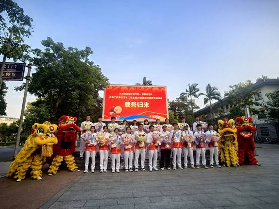 仪式现场,锣鼓喧天,掌声四起,四只威风凛凛的狮子在场地中跳跃、舞动,一派热闹喜庆景象。韦安光、马少健等校领导与独竹漂、板鞋运动队队员逐一亲切握手,学生代表为他们献上鲜花,向他们表示祝贺,鼓励他们继续秉承“平等、团结、拼搏、奋进”的宗旨,弘扬中华体育精神,传播民族体育正能量,砥砺前进,追求卓越,再立新功,为学校完善德智体美劳全面发展的育人体系,发挥体育在立德树人中的重要作用,作出新的更大贡献。