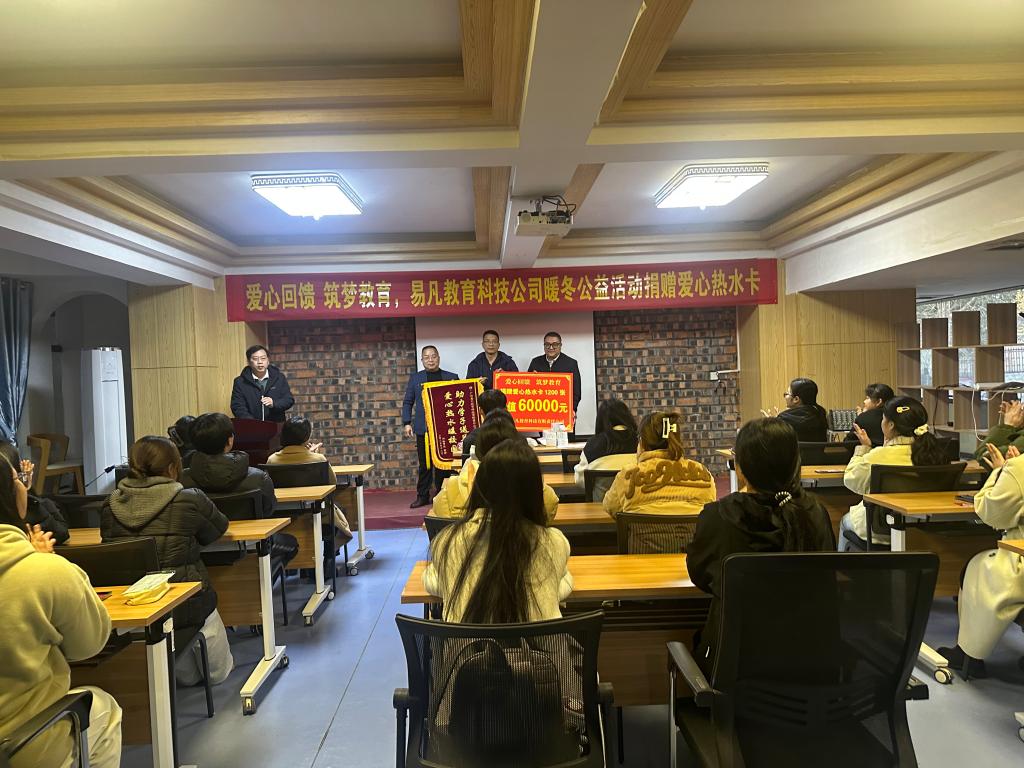 2025年12月24日,后勤管理处(基建处)联合易凡教育科技公司举办“爱心回馈 筑梦教育”暖冬公益捐赠活动,活动中,易凡教育科技公司为我校勤工助学学生捐赠面值50元热水卡1200张,总价值60000元。后勤管理处(基建处)副处长蓝凛为勤工助学学生代表发放爱心热水卡并在活动结束后与学生和企业代表合影留念,定格下这温暖的瞬间。
