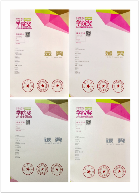 8.2018年6月,韩巧玲、符栢文同学在“第四第十届全国大学生广告艺术大赛广西赛区荣获一等奖;凌宏伟、曾童、王艺龙、韦瑞贤、林淑媚、黄诗婷、曾童、韩巧玲、符栢文同学分别荣获二等奖。