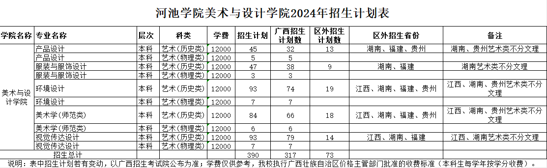 河池学院美术与设计学院2024年招生计划表