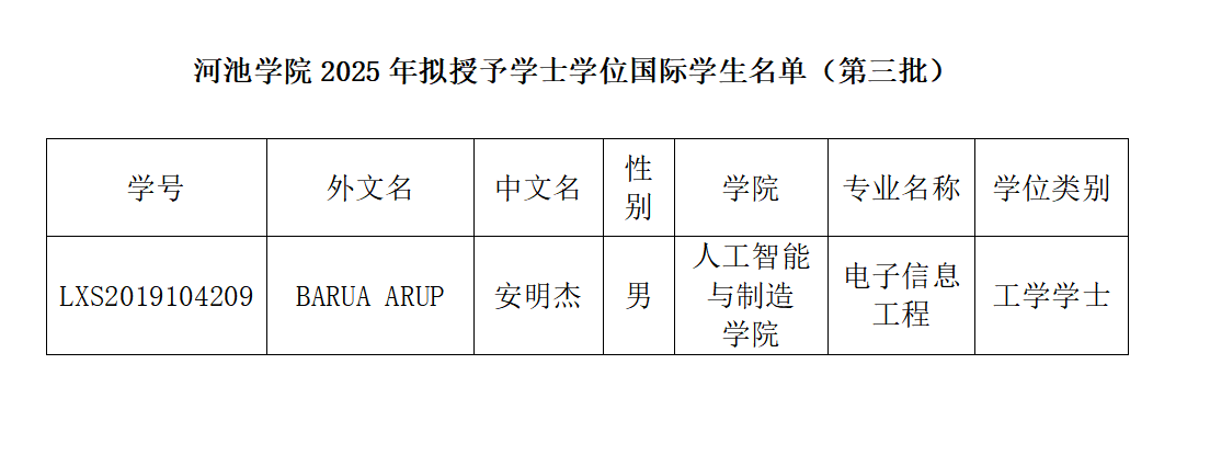 根据《河池学院国际学生学士学位授予实施细则》(校政发〔2022〕76号)精神,经国际教育学院初审,学校学士学位评定委员会办公室审核,国际学生BARUA ARUP修满了本专业培养计划规定的学分,毕业论文(设计)成绩为中等及以上,通过了《国际汉语能力标准》四级,达到我校国际学生授予学士学位的要求。经学校学士学位评定委员会审议,拟同意授予上述国际学生BARUA ARUP学士学位(学生详细情况见下表),现公示5天(2025年12月24日-2025年12月28日),如有异议,请以书面形式并署真实姓名,于2025年12月28日前报国际教育学院办公室(外语楼401)。