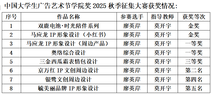 2025年12月28至29日,中国大学生广告艺术节学院奖2025秋季征集大赛·青春盛典在北京广播大厦演播厅举行。美设学院视传231廖英岸同学荣获金奖2项、一等奖2项、三等奖1项,传播类中三个命题分别获第二名、第四名、第五名。