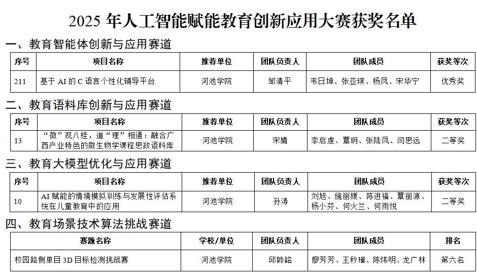 近日,自治区教育厅公布了2025年人工智能赋能教育创新应用大赛获奖名单,我校师生在四大赛道中表现优异,共获得二等奖两项、优秀奖一项,并在算法挑战赛中取得第六名,展现出我校在人工智能与教育融合领域的探索成果。