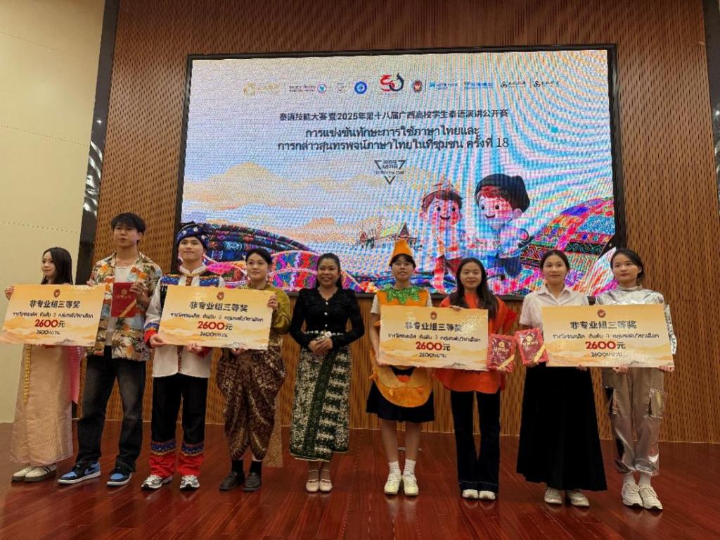 6月21日,泰语技能大赛暨2025年第十八届广西高校学生泰语演讲公开赛在广西民族大学圆满落幕。此次大赛由广西民族大学和泰王国驻南宁总领事馆联合主办,吸引了来自广西17所院校的69名选手参与角逐,规模超过历年。大赛以“青年携手,共绘中泰未来50年新蓝图”为主题,恰逢泰中建交50周年这一历史性时刻,意义非凡。我校外国语学院派出商英222班严文琪和英语224班张燕钱两位队员参赛。