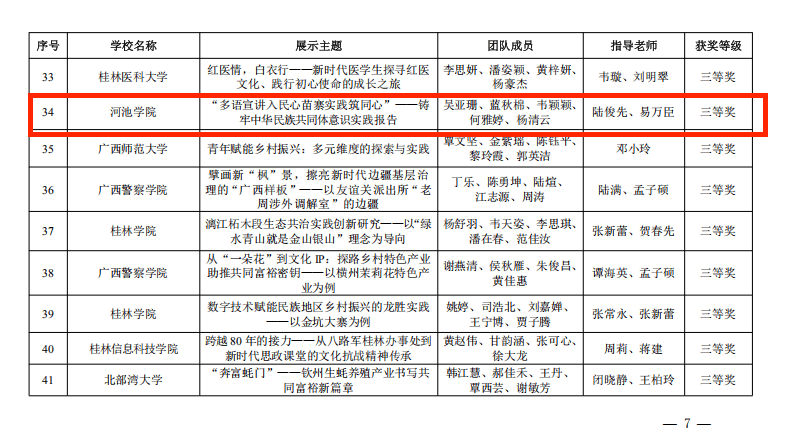 大赛聚焦思政课理论与实践结合,我校参赛作品紧扣时代命题:《“多语宣讲入民心,苗寨实践筑同心”——铸牢中华民族共同体意识实践报告》通过多元实践形式探索铸牢中华民族共同体意识的路径,体现了青年群体的责任担当;《从课堂到田野:罗城民族村乡村振兴的实践路径与育人价值》扎根河池本地罗城民族乡村实际,挖掘青年参与乡村振兴的实践模式与价值内核,彰显了高校服务地方发展的使命。