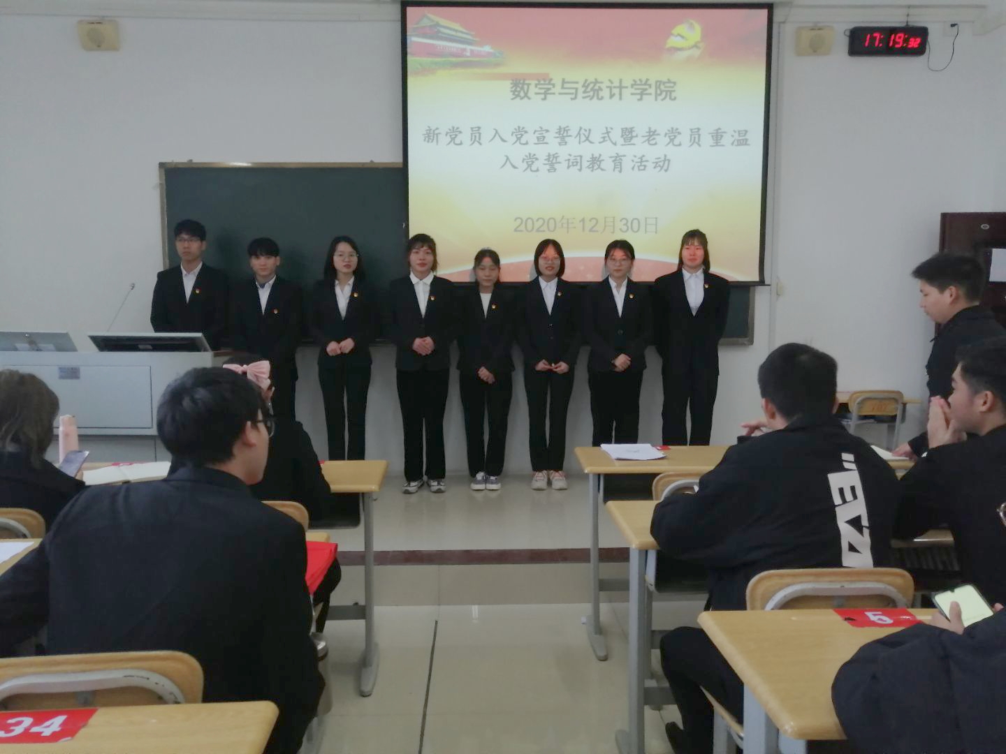 2020年下半年,数统学院学生党支部接收了蓝梦婷等20名预备党员,经学院党委审批,2020年12月30日下午,学生第一、第二党支部在格致楼709教室举行了庄严的学生党员宣誓活动。
