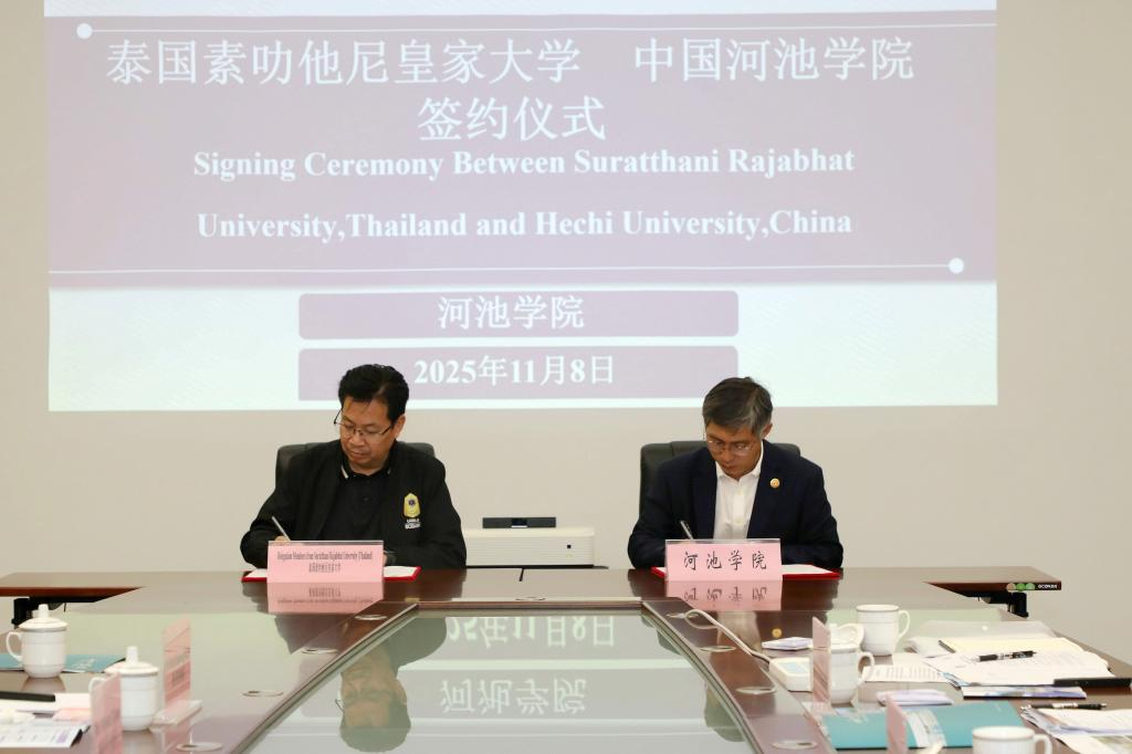 On November 8th, a delegation of six from Suratthani Rajabhat University, Thailand, led by President Wattana Rattanaprom, visited our university. The two institutions held a symposium in Meeting Room 1507 of Zhiyuan Building, and signed a Memorandum of Understanding (MoU) to further deepen practical collaboration in education and agriculture. Ma Shaojian, the President of our university, along with heads of relevant departments, and officials from the Hechi People's Association for Friendship with Foreign Countries attended the meeting.
