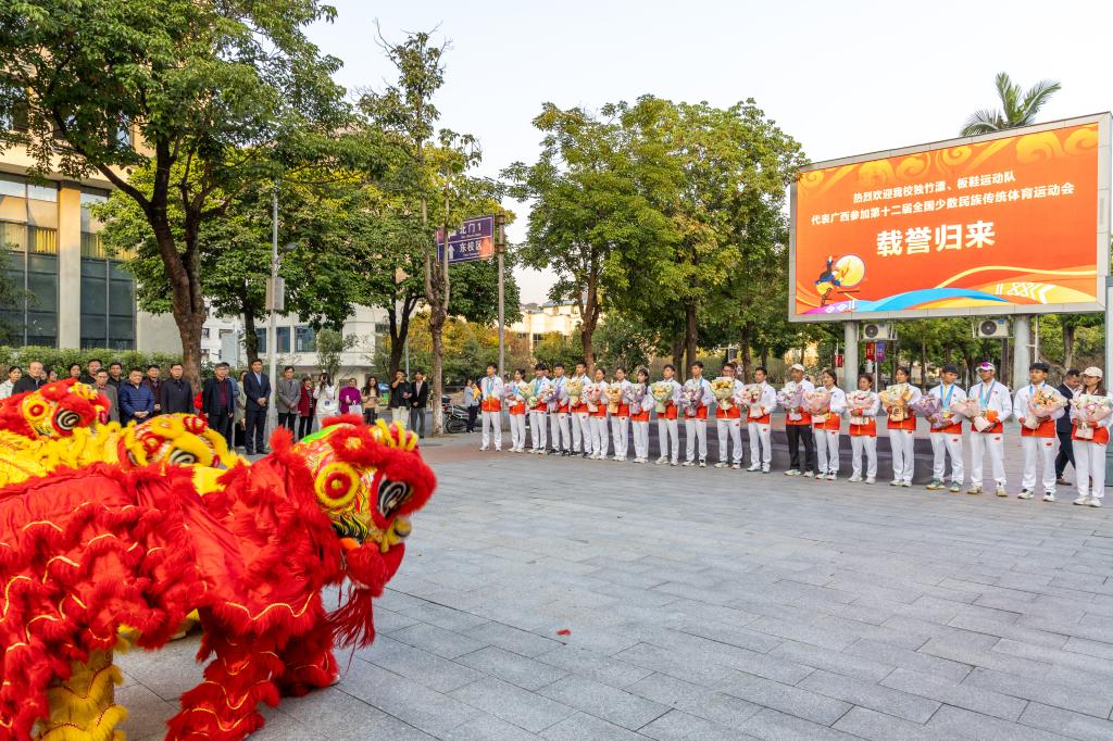 仪式现场,锣鼓喧天,掌声四起,四只威风凛凛的狮子在场地中跳跃、舞动,一派热闹喜庆景象。韦安光、马少健等校领导与独竹漂、板鞋运动队队员逐一亲切握手,学生代表为他们献上鲜花,向他们表示祝贺,鼓励他们继续秉承“平等、团结、拼搏、奋进”的宗旨,弘扬中华体育精神,传播民族体育正能量,砥砺前进,追求卓越,再立新功,为学校完善德智体美劳全面发展的育人体系,发挥体育在立德树人中的重要作用,作出新的更大贡献。
