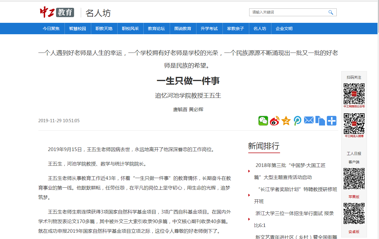 12-052019【中工教育】一生只做一件事——追忆河池学院教授王五生纪念王五生教授2019年9月15日,王五生老师因病去世,永远地离开了他深深眷恋的工作岗位。王五生,河池学院教授、数学与统计学院院长。王五生老师从事教育工作近43年,怀着“一生只做一件事”的教育情怀,长期奋斗在教育事业的第一线。他默默耕耘,任劳任怨,在平凡的岗位上坚守初心,用生命的光辉,追梦筑梦。王五生老师生前连续获得3项国家自然科学基金项目,3项广西自科基金项目。在国内外学术刊物发表论文170多篇,其中被外文三大索引收录9... -