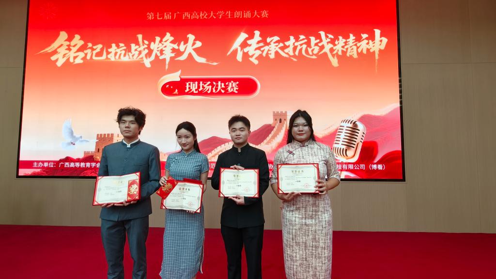 11月16日,第七届广西高校大学生“铭记抗战烽火 传承抗战精神”朗诵大赛决赛在南宁师范大学圆满落幕。我校教师教育学院廖馨甜、秦文汉、周露的合诵作品《红铁》,音乐舞蹈学院刘凯利的独诵作品《我用残损的手掌》分别荣获本科组一等奖。郭英莉、高晋荣获“优秀指导教师”称号。