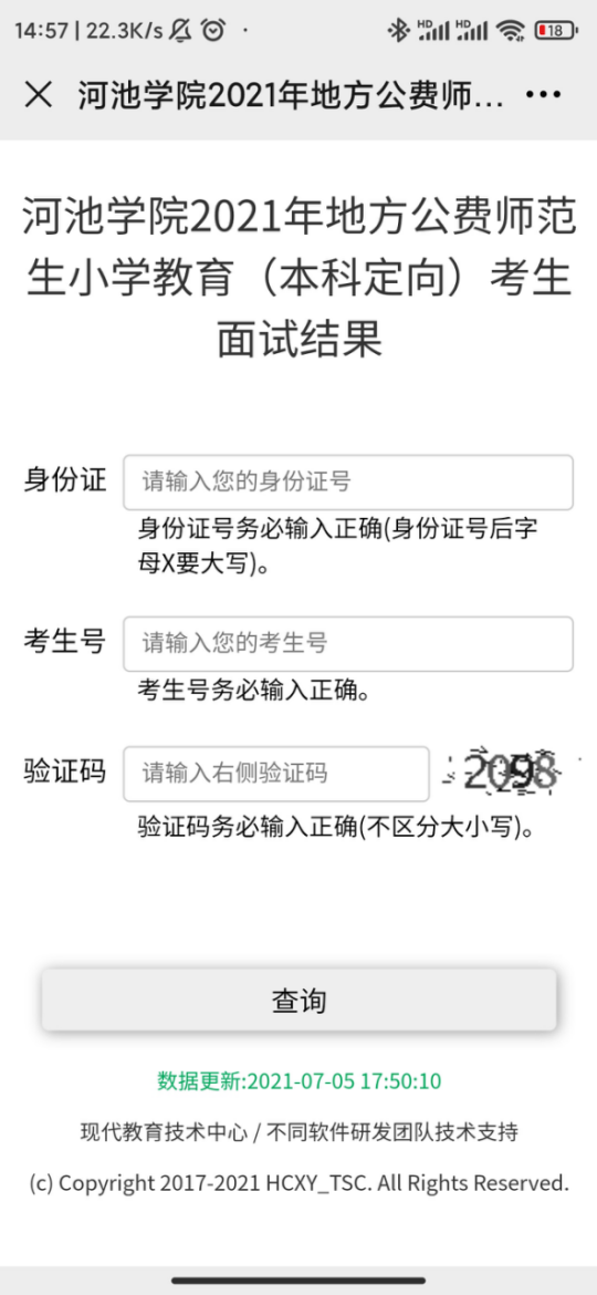 河池学院2021年地方公费师范生小学教育(本科定向)面试结果查询开通啦,各位考生可通过以下两种方式查询自己的面试结果: