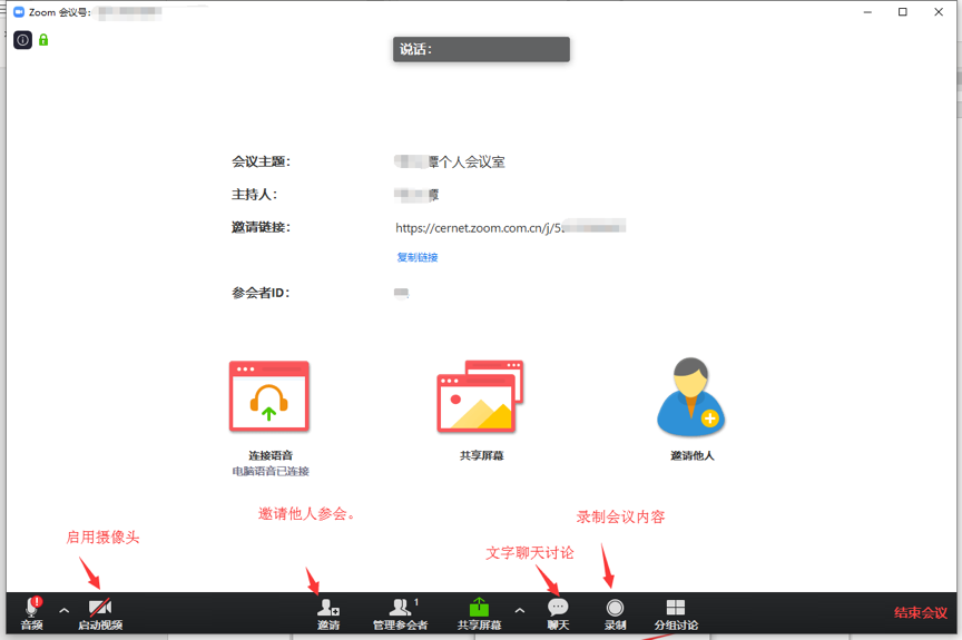 4.安装并启动会议:在网页或手机上下载安装ZOOM软件后,登录后就可以启动会议了。通过下方的“邀请”按钮,可以将参会地址发给参会人员。通过“共享屏幕”能实时的分享您的屏幕内容。通过“录制”您可以将会议或课程内容录制下来并在会(课)后分享给相关人。