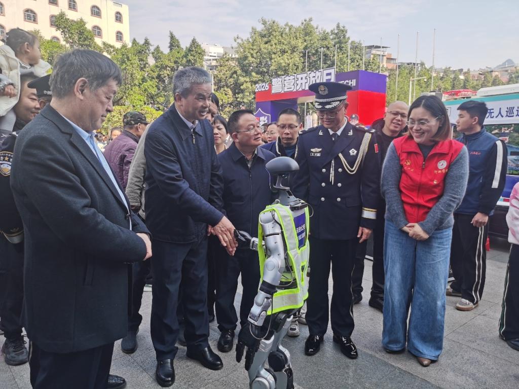 2026年1月10日上午,学生第一党支部书记郑瀚同志带领3名学生党员,携带人形机器人、机器狗以及两轮平衡车科技设备,赴广西河池市金城江区文化广场,与河池市公安局联合开展“人工智能+警务”实践共建活动。市委常委、政法委书记陆祥红,副市长、公安局长梁金昌,市人大常委会副主任陈会邦,市政协副主席韦祖林莅临现场,参观指导本次校警共建工作。