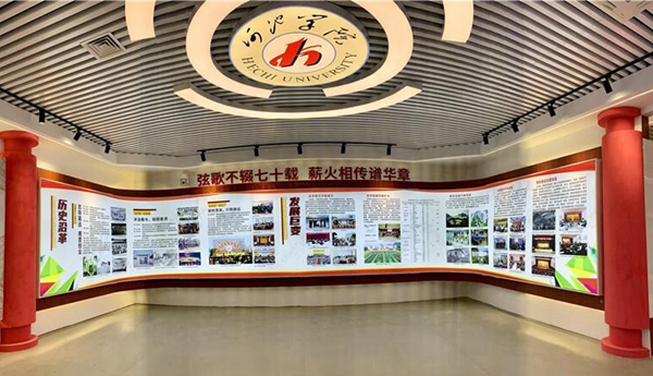校史馆分三个厅四个板块,第一厅“弦歌不断七十载 薪火相传谱华章”,主要展示办学70年来历经宜山师范学校、河池师专、河池学院三个办学历程的发展沿革和发展巨变。第二厅主要展示办学70周年扎根老区写春秋、初心不改育新人的成效和特色。第三厅主要展示办学70周年过程中涌现出来的优秀老师和优秀校友代表,以及学校未来发展篇章。