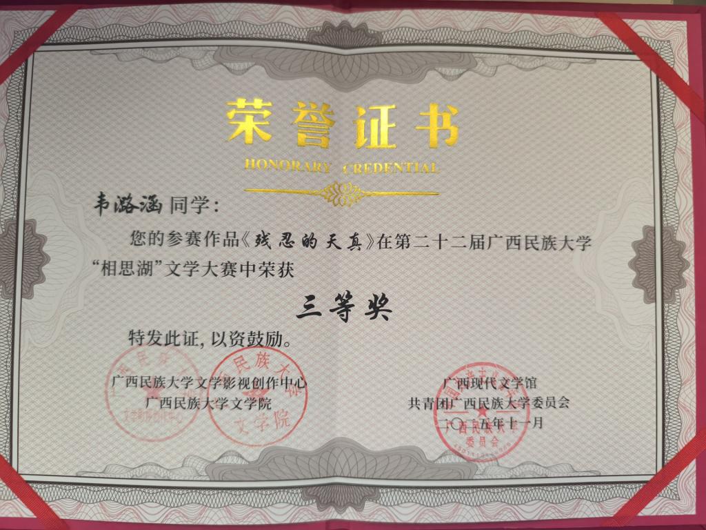 其中,白云诗社赖琦同学的诗歌作品《重新爱上草木形状的你》荣获二等奖,韦潞涵同学的散文作品《残忍的天真》荣获三等奖。