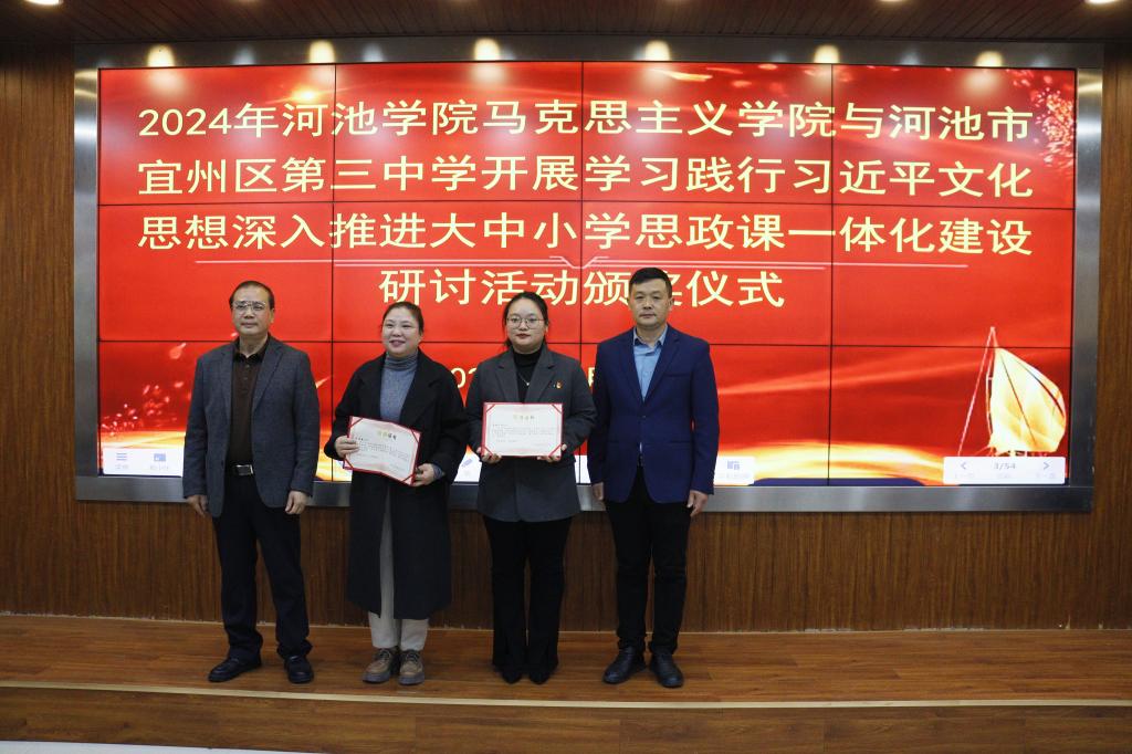 闭幕式中,首先由马克思主义学院执行院长江洪明就两校合作开展大中小学思政课一体化建设研讨活动进行总结,并同宜州区第三中学兰雄刚校长一起为本次教学课例展示教师以及两校师生合作参加2024年全国大学生数字素养与技能大赛荣获一等奖的获奖者进行颁奖。随后还举行了河池学院马克思主义学院与河池市宜州区第三中学指导老师互聘仪式。