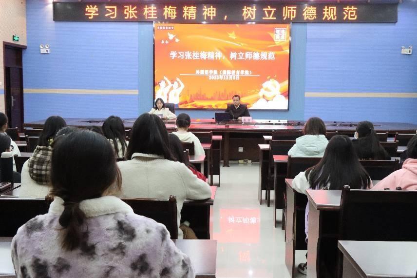 12月5日晚,由外国语学院(国际教育学院)承办的河池学院第七十六期“道德讲堂”在图书馆122如期举行。本期讲堂主题为“学习张桂梅精神,树立师德规范”,由我院张雁老师主持,党委书记韦合主讲。学生代表、全体团学成员以及第二期入党积极分子参加了本次活动。