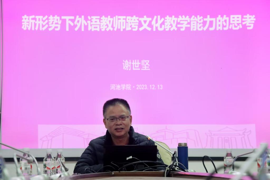 2023年12月13日,广西师范大学外国语学院谢世坚教授莅临我院讲学,讲座在东区行政楼206举行。讲座由我院党委书记韦合主持,我院全体教职工参加。