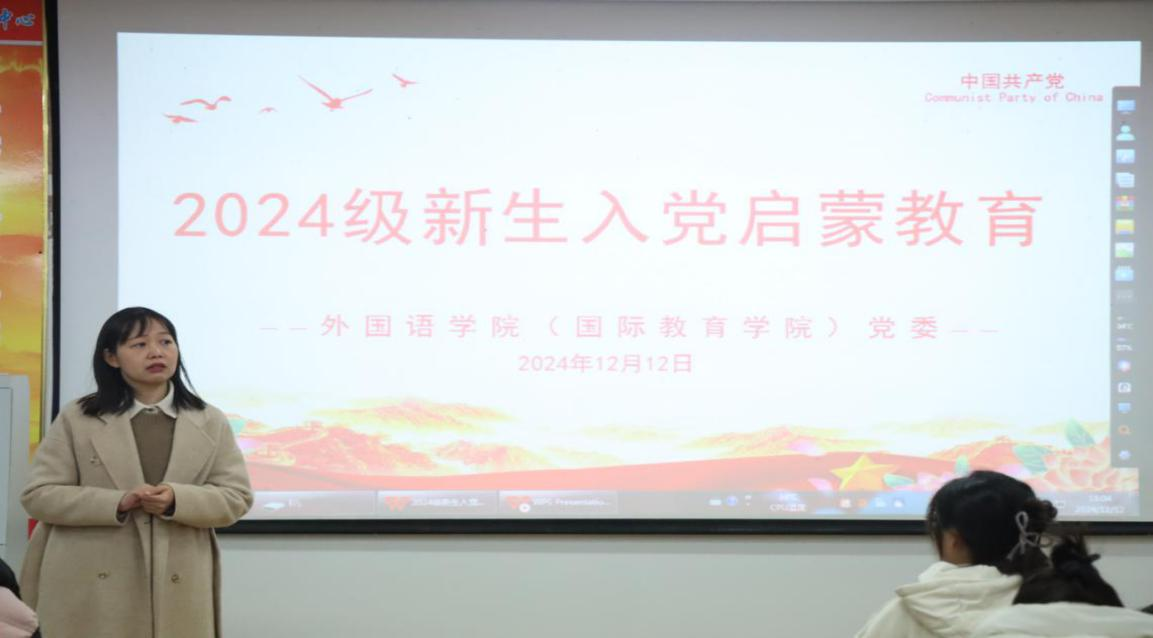 为给2024级新生种下信仰的种子,明确前行的方向,12月12日晚,我院在外语楼205开展2024级新生入党启蒙教育,由学院团委书记张雁主讲,2024级各班新生共同参加。