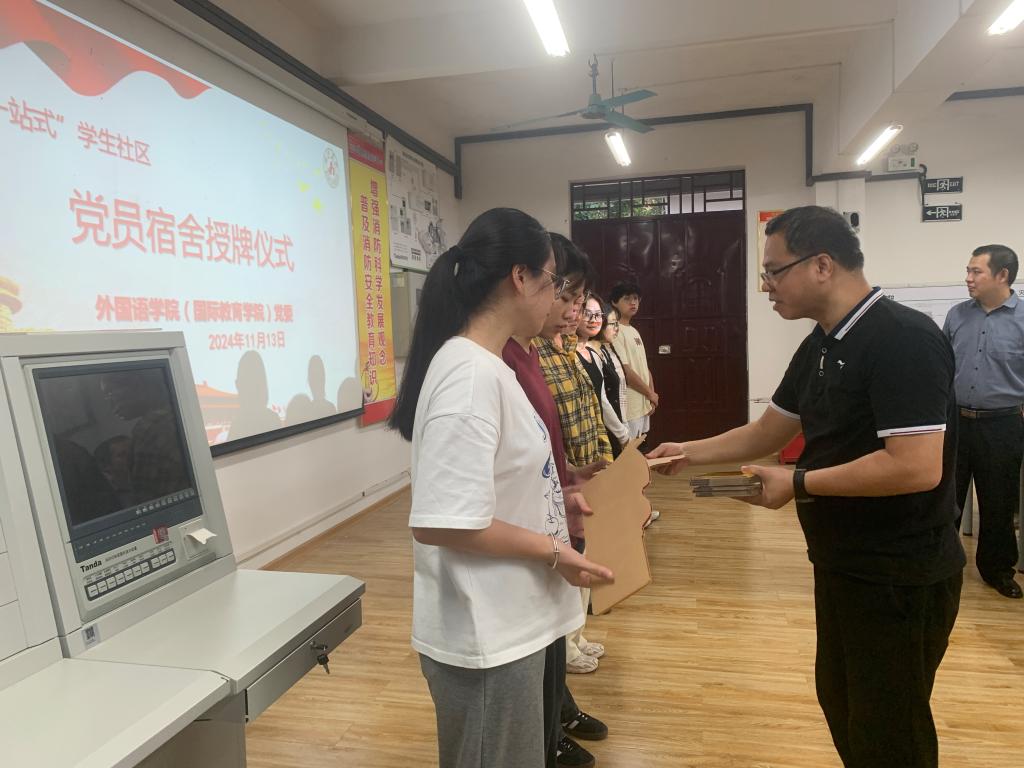 韦合指出,当前,全国上下正深入学习党的二十届三中全会精神,全校正全面贯彻落实学校第四次党代会精神,外国语学院(国际教育学院)认真开展各项工作,努力推进学院高质量发展,在学院各项工作中,党委、支部和党员要在各方面、全过程起到先锋模范带头作用。今天在这里举行正式的仪式,给党员宿舍授牌,就是为了让大家进一步明确这个认识。