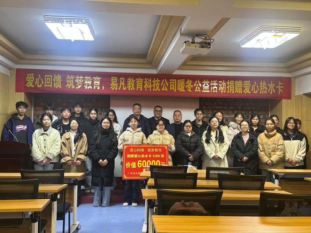 2025年12月24日,后勤管理处(基建处)联合易凡教育科技公司举办“爱心回馈 筑梦教育”暖冬公益捐赠活动,活动中,易凡教育科技公司为我校勤工助学学生捐赠面值50元热水卡1200张,总价值60000元。后勤管理处(基建处)副处长蓝凛为勤工助学学生代表发放爱心热水卡并在活动结束后与学生和企业代表合影留念,定格下这温暖的瞬间。