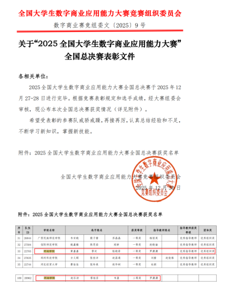 近日,2025全国大学生数字商业应用能力大赛数字贸易综合运营赛道全国总决赛圆满落幕,河池学院外国语学院2023级商务英语专业黄嘉嘉、黎欢、陆晓菲团队荣获一等奖,赵乐诗、黎桂芬、韦盈团队荣获二等奖,学校获评“优秀组织奖”。