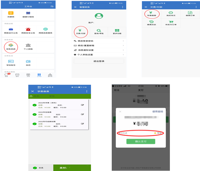 成功登录企业微信之后,通过工作台的【财务系统】【交费/付款】菜单进入,显示学费缴费明细列表,点击【支付】按钮后选择支付方式(微信),支付金额可根据实际情况点击缴费项右方笔形图标手动输入,也支持选取缴费项,如下图标记(已办理生源地助学贷款的同学仅需缴纳教材费)。点击支付按钮,会跳转到微信收银台,显示缴费内容,可继续点击立即支付弹出的密码输入框中输入支付密码完成学杂费缴费,如下图所示。