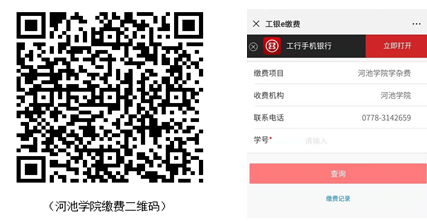 2.中国工商银行缴费:学生在办理缴费业务时与经办柜员说明办理工银e缴费业务(9551交易),报上院校名称(河池学院)、学生学号,然后将学杂费缴存银行,即可完成缴费。(仅限广西区内)