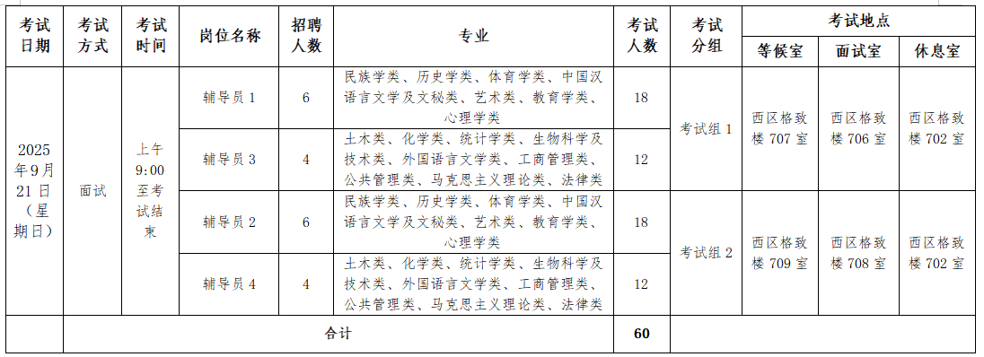 3.本次公开招聘考试资格审查时间为9月20日8:00--8:30、9月21日8:00--8:30。9月20日笔试资格审查地点在笔试考试教室;9月21日资格审核地点在面试、试讲等候室。