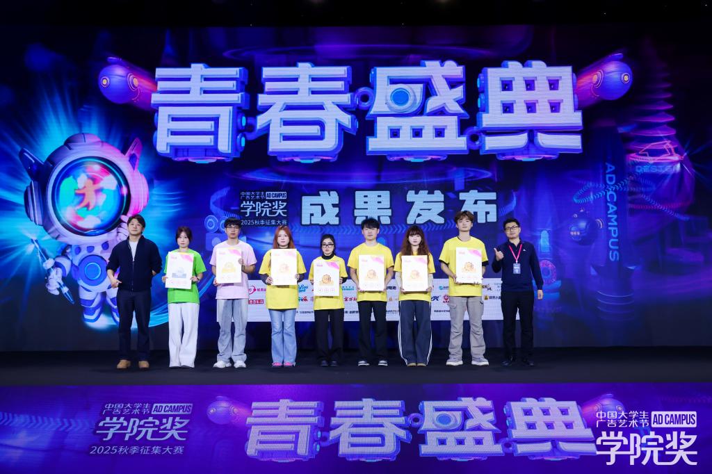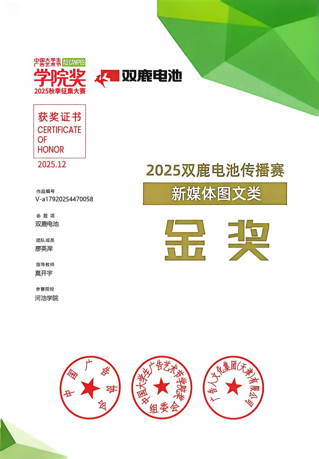 2025年12月28至29日,中国大学生广告艺术节学院奖2025秋季征集大赛·青春盛典在北京广播大厦演播厅举行。美设学院视传231廖英岸同学荣获金奖2项、一等奖2项、三等奖1项,传播类中三个命题分别获第二名、第四名、第五名。