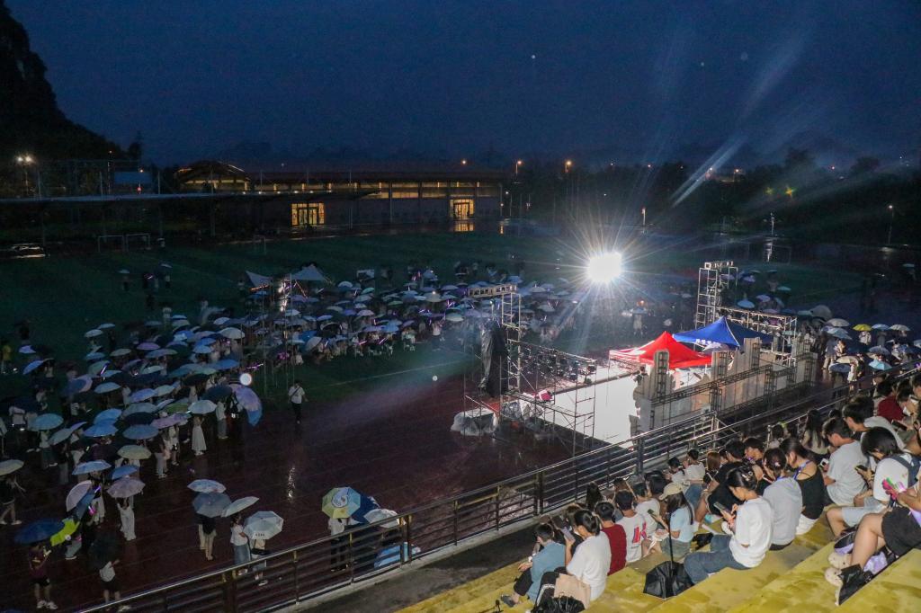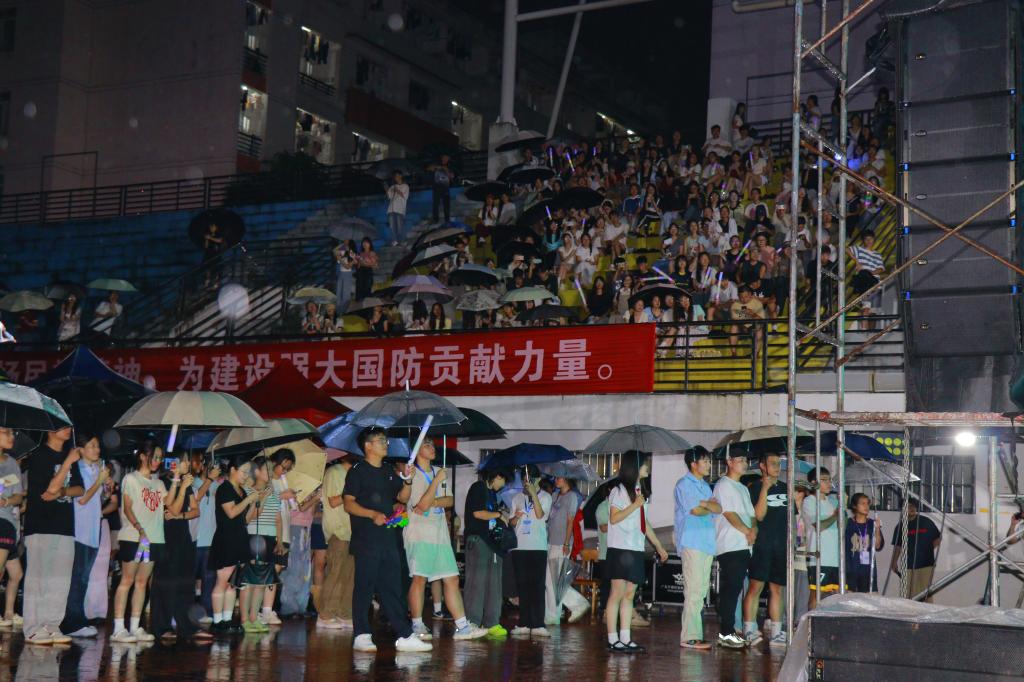 演出当晚阵雨不断,却抵挡不住在场人员的热情。音乐舞蹈学院乐队火热开场,瞬间点燃现场氛围。随后,22个节目轮番上演,涵盖独唱、合唱、舞蹈等形式。观众手持荧光棒随音乐摆动,现场荧光闪烁,其乐融融。最后,由全体表演者合唱《凤凰花开的路口》,为这场音乐会拉下帷幕。