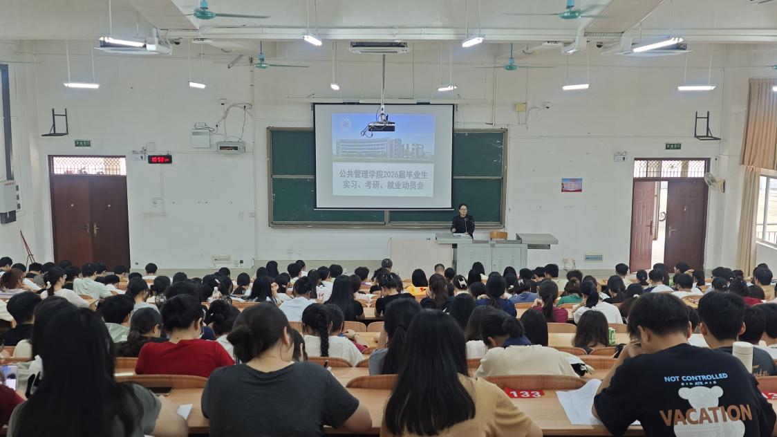 6月26日上午,公共管理学院在弘毅楼1-102教室召开2026届毕业生实习、考研、就业动员会。学院党委书记韦福,副书记、副院长(主持行政工作)钟卓良,2026届毕业班班主任及辅导员出席会议,全体2026届毕业生参加。会议由负责就业的辅导员何丽秀主持。