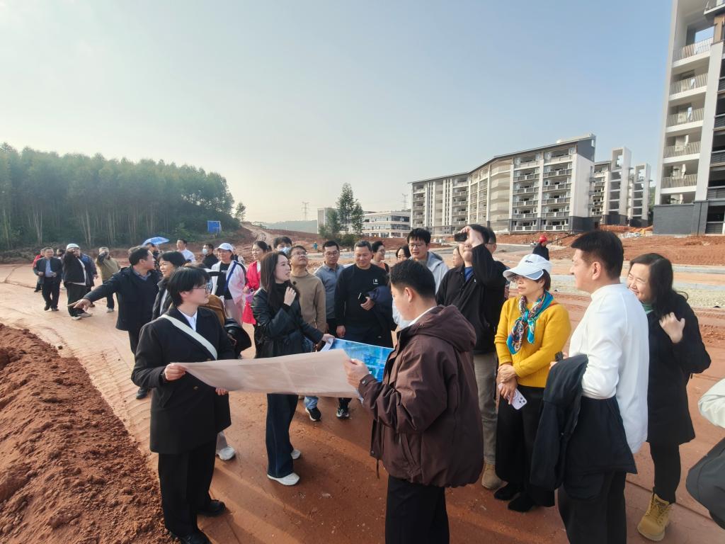 在新校区建设指挥部负责人带领下,考察团实地走访了整体规划展示区、A1教学楼、学生宿舍、食堂、实训楼及校园景观带等核心区域。负责人解读了“生态化、智能化、特色化”建设理念,重点介绍了校区功能分区、工程建设进展,以及未来在服务地方民族文化传承、应用型人才培养、乡村振兴战略实施等方面的发展定位,深入阐释了新校区对支撑学校学科建设、提升办学实力、助力河池市经济社会发展的核心价值。