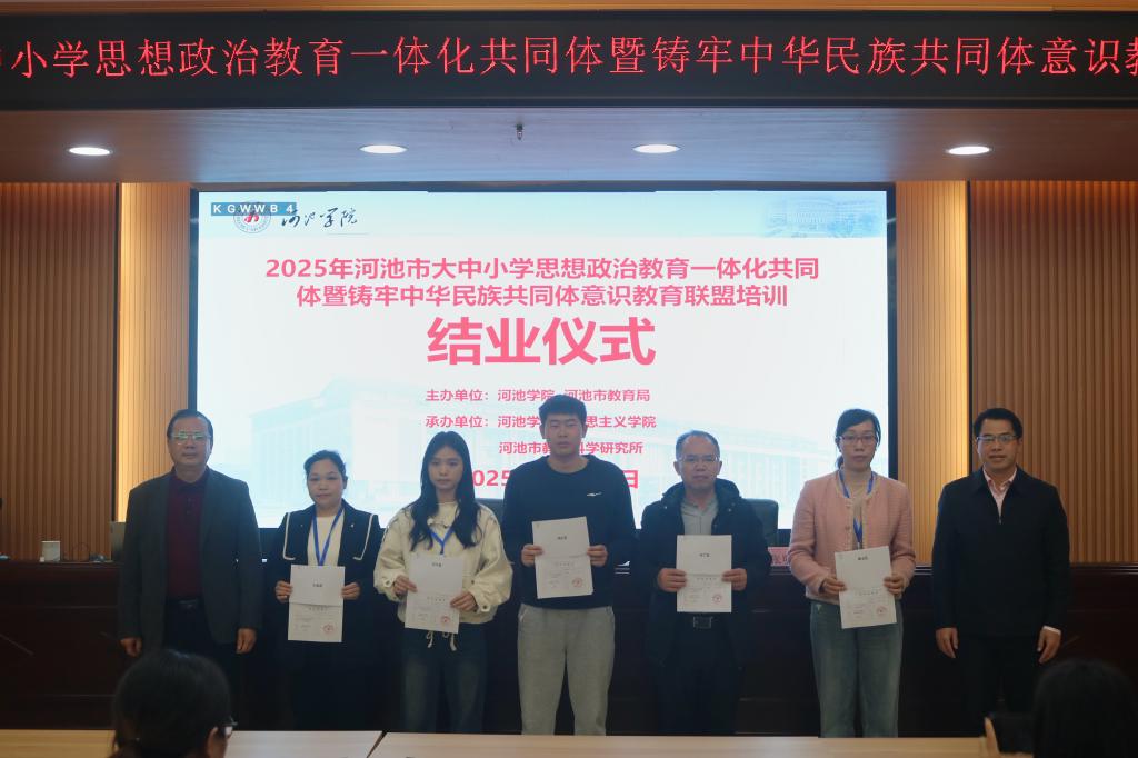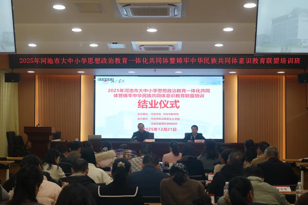 12月19日至21日,2025年河池市大中小学思政教育一体化共同体暨铸牢中华民族共同体意识教育联盟培训班在河池学院举办。本次培训由河池学院、河池市教育局联合主办,河池学院马克思主义学院、河池市教育科学研究所承办,全市70余名县(区)教育行政负责人及联盟校骨干教师参训,聚焦思政教育一体化建设与铸牢中华民族共同体意识教育实践路径开展研讨。