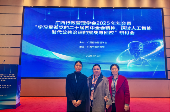 12月14日,广西行政管理学会2025年年会暨“学习贯彻党的二十届四中全会精神,探讨人工智能时代公共治理的挑战与回应”研讨会在南宁召开。学院副院长肖海燕、行政管理教研室主任李荷英以及蔡霞老师一同参会,与全区部分高校、科研院所的专家学者及代表围绕人工智能时代的公共治理展开深入交流。