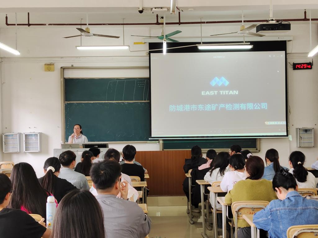 4月24日,防城港市东途矿产检测有限公司应邀到化学与生物工程学院开展专场招聘宣讲会,学院2022级应用化学专业学生参加宣讲会。