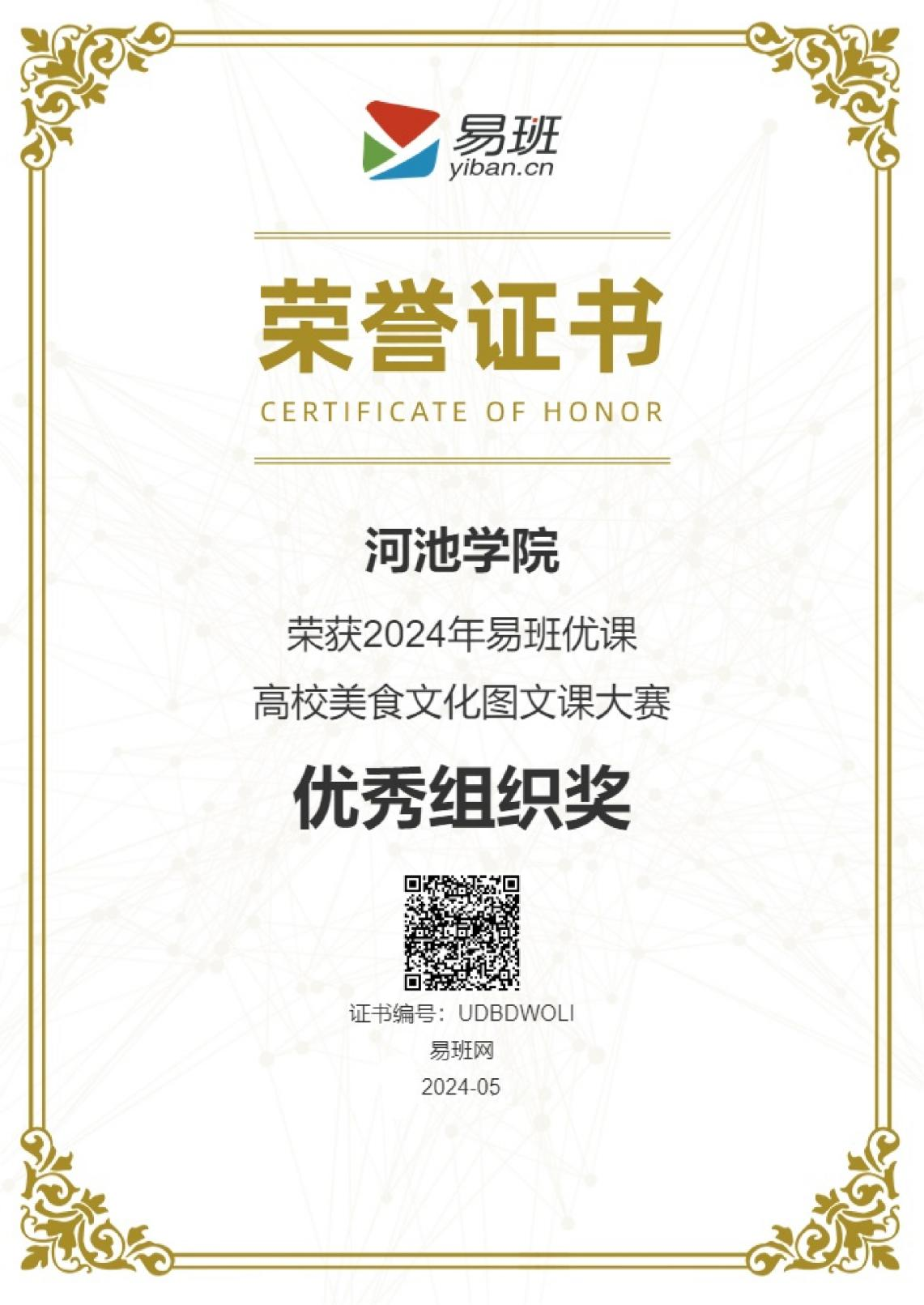近日,由全国易班网举办的2024年度易班优课高校美食文化图文课大赛评选结果公布,我校荣获“优秀组织奖”荣誉。