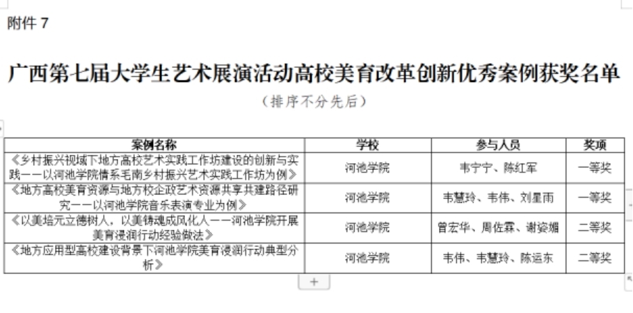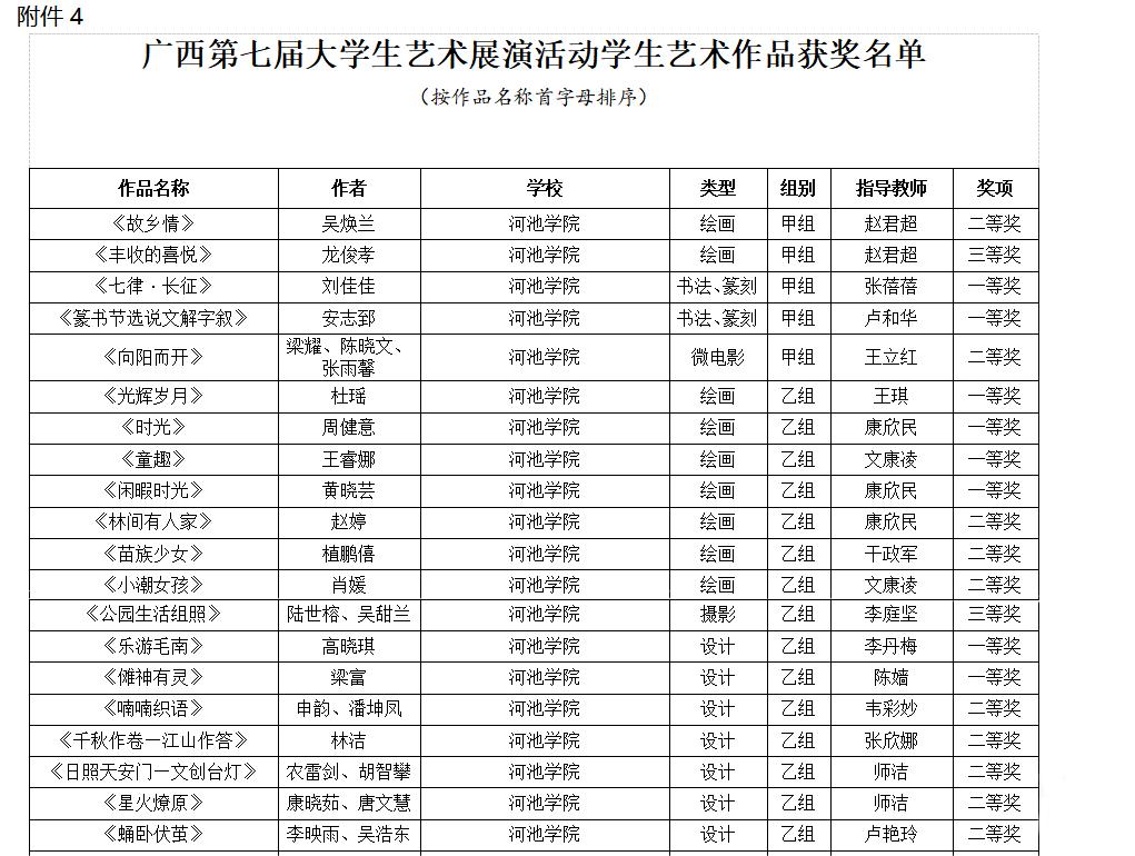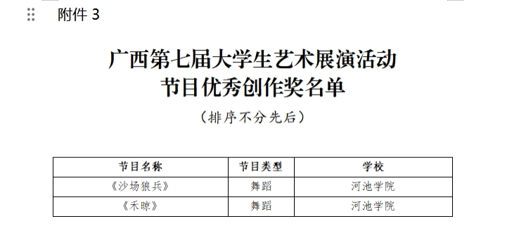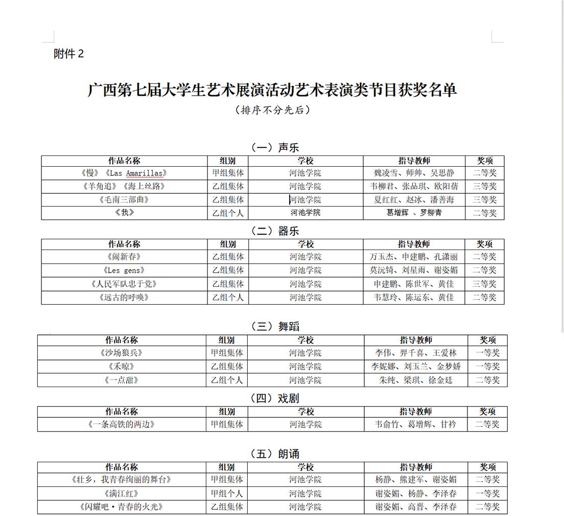 近日,据自治区教育厅文件获悉,我校在广西第七届大学生艺术展演活动共获得一等奖13项、二等奖22项、三等奖5项的好成绩,同时学校并在本届艺术展演活动中获优秀组织奖。