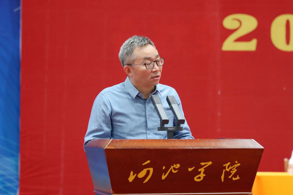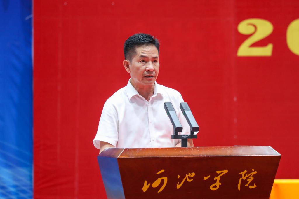 马少健在致辞中介绍了河池市和学校的基本情况。他指出,正是河池山美水美、人杰地灵和独特资源,孕育和壮大了我们河池学院。70多年来,河池学院代代师生薪火相传、弦歌不辍,用七十余载书写了独特的光辉奋斗史,铸就了“作家的摇篮”“桂西北中小学教师的摇篮”“地方民族文艺体育冠军的摇篮”三张闪亮名片。马少健勉励新生们“不忘来时路,融入时代潮,做不甘平庸的河院新人”。他说,要尽快理解适应大学阶段学习生活方式,成功实现个人的升级转段,尽快把自己融入新环境,对自己进行再发现、再考验、再提升;要认真学好思政课程,厚植家国情怀,为未来站稳人民立场,听党话、跟党走,以及个人事业发展和家庭幸福行稳致远打下扎实的思想和理论基础。要加强专业理论学习和实践锻炼,夯实职业基础,争取未来靠专业敲门、靠能力闯关、靠精神持续、靠品格上进;要培养兴趣特长,锻造健康身心,在专业课程学习之外,积极利用学校资源,加强锻炼、挖掘潜能、培养兴趣;要积极拥抱AI,融入时代潮流,先做“追随者”,再做“驾驭者”,在不断淬炼中提升自己。